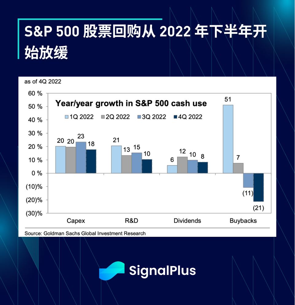 未来 3 周,美国股票财报季将进入高潮,摩根大通和花旗已经率先公布财报结果,由于净利息收入高于预期,两者皆展示了良好的业绩成果。尽管经济放缓,但投行预计 2023 年度 S&P 500 EPS 将持平或小幅上涨,落在约 225 美元,不过股票回购预计将有所放缓。