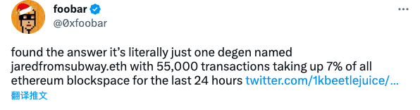 包括 0xfoobar 在内的多名 KOL 在调查后发现,过去数日 gas 价格上涨的元凶大致可以定位到一个 ENS 解析域名为 jaredfromsubway.eth 的地址 0xae2Fc483527B8EF99EB5D9B44875F005ba1FaE13。