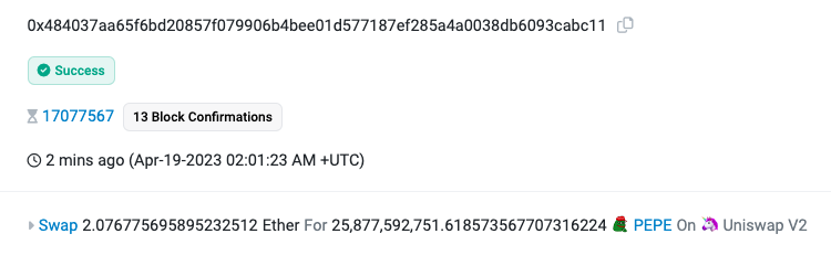 今日 10: 01: 23 时发生在同一个区块内的两笔交易可以被视作 jaredfromsubway.eth 的典型操作手法。在 0x4840 开头的交易中,jaredfromsubway.eth 使用 2.076 ETH 换得了 25,877,592,751 PEPE,然后又在 0xfa48 开头的交易中将这些 PEPE 全部换得了 2.098 ETH。