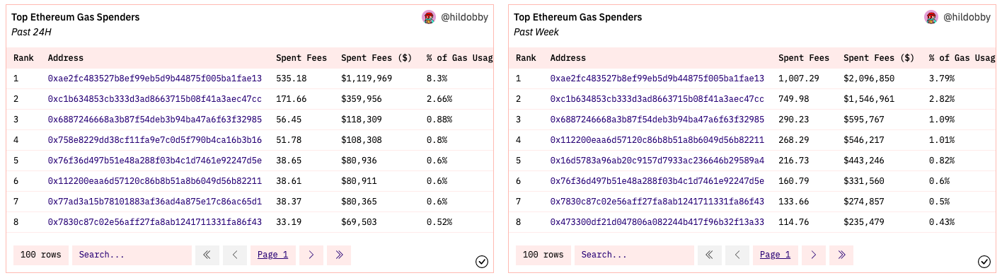Dune Analytics(主页:Ethereum Gas)数据显示,在过去 24 小时内,jaredfromsubway.eth(图中 0x ae 2 开头地址)仅 gas 就消耗了 535.18 ETH(这么看单笔消耗约 0.01 ETH),价值约 1119969 美元,占全网数据的 8.3% ;而在过去一周内,该地址更是消耗了 1007.29 ETH,价值约 2096850 美元,占全网数据的 3.79% 。