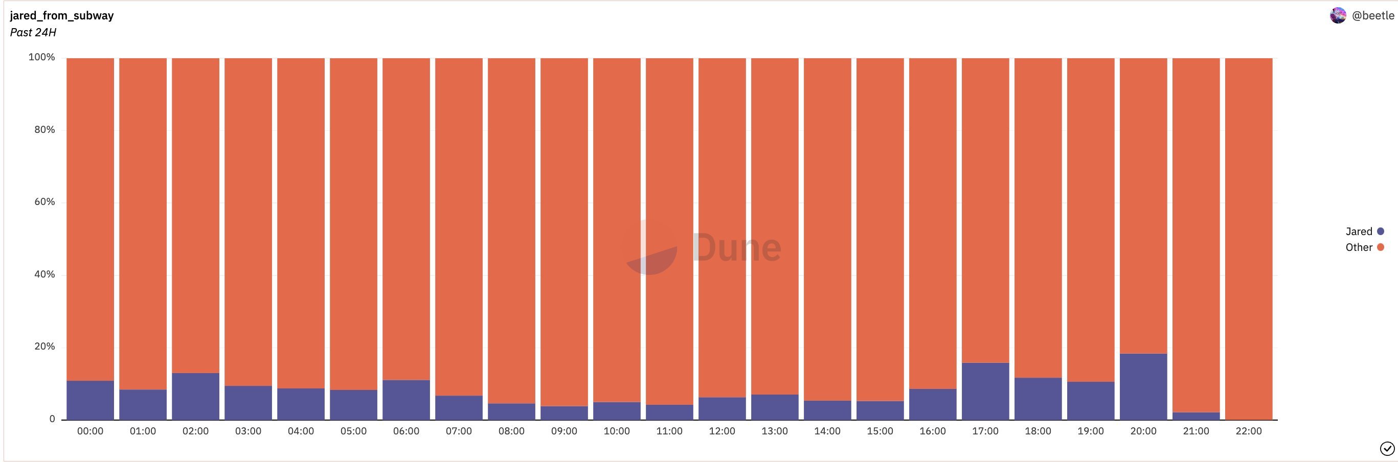 The Block 研究分析师 beetle 则给出了一个更直观的视图,对比了过去 24 小时内 jaredfromsubway.eth 与其他所有人的 gas 消耗情况,足以看出其一人对主网 gas 波动的影响程度。