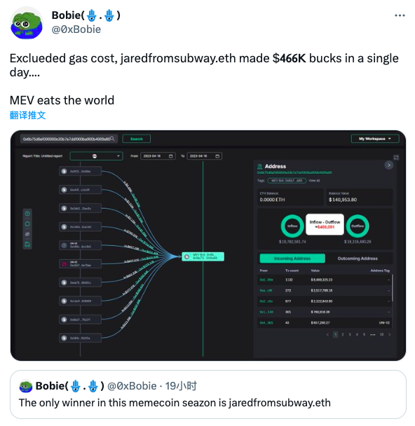 jaredfromsubway.eth 发起的所有交易基本均属于此类,单笔获利金额或许不大,但胜在极高频。根据 0xScope Builder Bobie 的分析,刨除掉 gas 成本,该地址在一天之内即可获利 46.6 万美元。