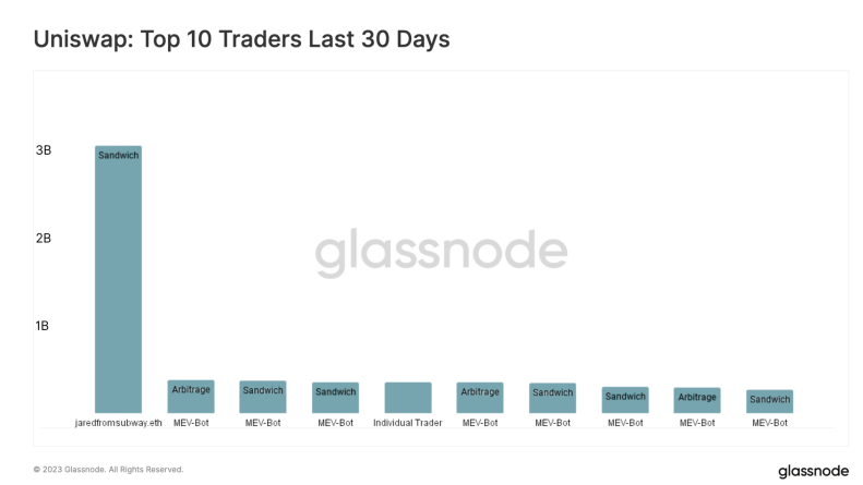 将被标记为前 10 名交易者的地址进行比较之后,发现仅有一个交易商的地址与 MEV 机器人无关。在过去的一个月中,知名 MEV 机器人 Jaredfromsubway.eth 的交易量高达 30 亿美元。