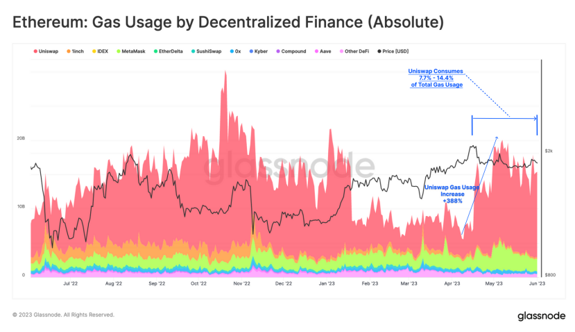 如果按协议分析 DeFi 的 gas 消耗,可以很快确定 gas 消耗的主要提升是由去中心化交易所的交易活动驱动的。Uniswap 仍然是主要贡献者,自 4 月以来的 gas 使用量增加了 388 %,现在占以太坊 gas 总需求的 7.7 %至 14.4 %。