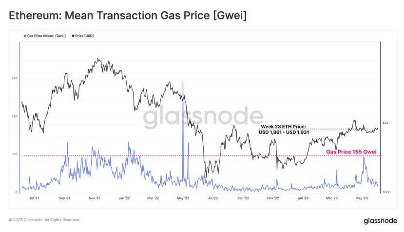 自今年 3 月份以来,ETH 价格一直在相对稳定的范围内震荡,在这个阶段,平均 gas 费为 76 GWE。但 gas 价格在 5 月份经历了较为明显的上涨, 5 月初的平均 gas 费达到 155 GWEI,几乎达到了 2021 – 2022 年牛市周期的水平。