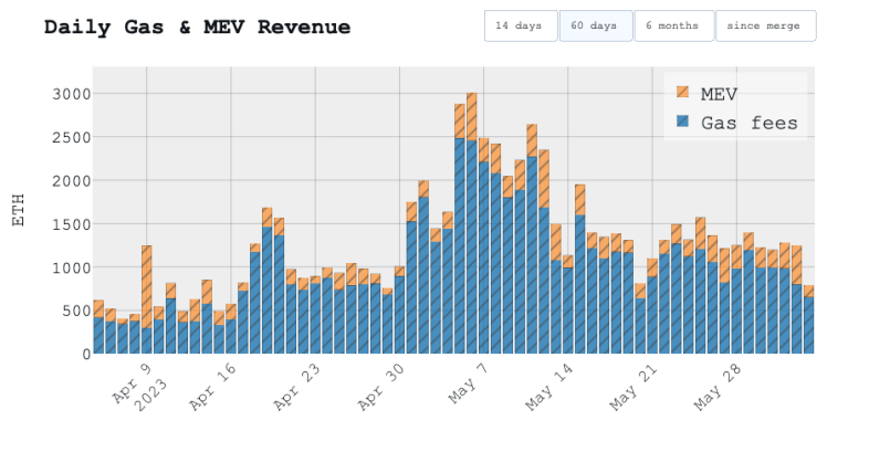 尽管这些交易机器人的活动可能对以太坊的最终用户有害,但它确实给以太坊验证者带来了好处。在过去的一个月中,由于优先费用的增加,验证者不仅获得了更高的奖励,而且还受益于 MEV-Boost 付款,这些付款来自于以最有利可图的方式完成交易的交易者和机器人。