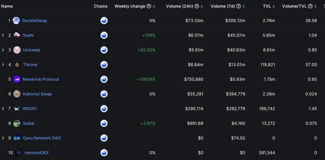 In terms of transaction volume, in the past 7 days, the transaction volume in the Base ecosystem has reached more than 400 million US dollars.DackieSwapLeading position with 7-day trading volume of $300 million, followed bySushi and Uniswap, the seven-day trading volume was above US$40 million.