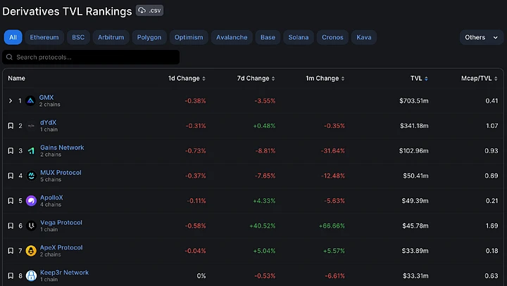 デリバティブトラックでは、GMX が最も高い TVL を持ち、次に dYdX、Gains Network、NUX Protocol、ApolloX が続きます。