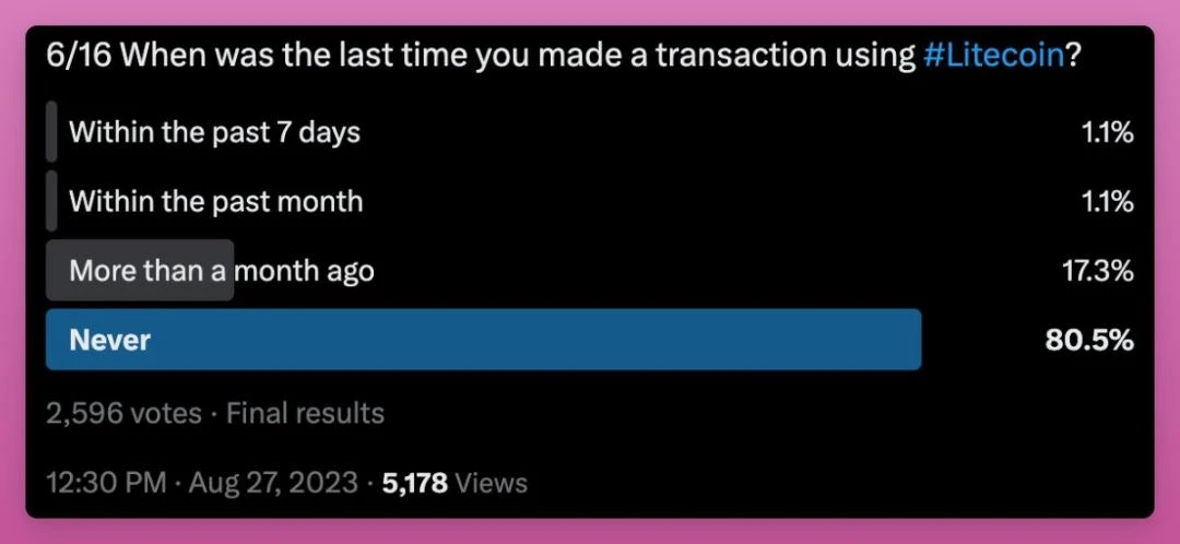 过去 7 天内只有 28 人使用过莱特币,而超过 97.8% 的人要么从未使用过,要么在一个多月前使用过。