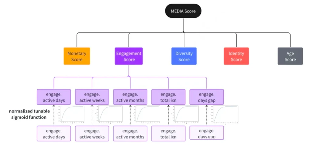 今年 8 月,Trusta Labs 曾发文详细介绍了其链上行为评分标准 MEDIA Score。MEDIA Score 具有两层效用,一是为项目方提供一个客观、公正、可量化的指标,全面评估用户地址的参与程度和价值水平,进而精准定位那些真正为项目做出过贡献的用户;二是帮助用户自身更清晰地掌握自己的地址行为,评估自己获得潜在社区奖励(即空投)的机会,从而更合理、高效地进行链上交互。