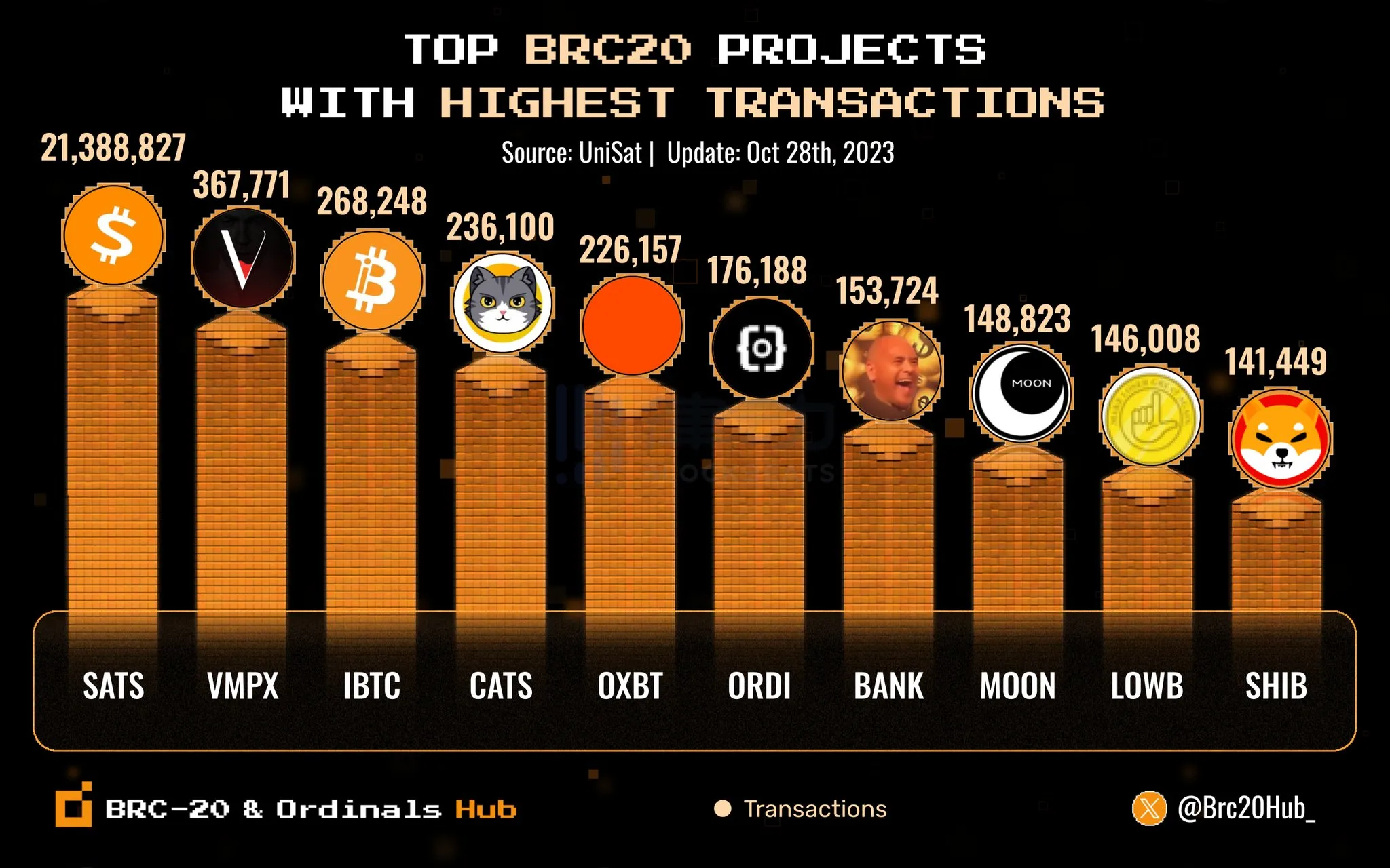 据 Tradingview 数据,BRC 20 价格呈上升趋势,ordi 本月涨幅达到了 38.87% 。目前,$SATS 交易量高达 21, 388, 827 笔,在打破交易量记录的 BRC 20 项目中遥遥领先。截止 10 月 28 日数据,BRC 20 最高交易额的项目排行榜如下: