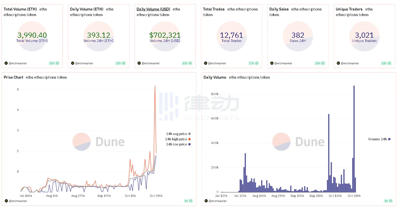 随着流量带来的价格上涨,社区中「 1 ETHS= 1 ETH」的呼声也越来越高,如今,我们有幸看到这一「壮举」完成,ETHS 作为以太坊铭文的独生子,价格已被抬到 1800 美元。