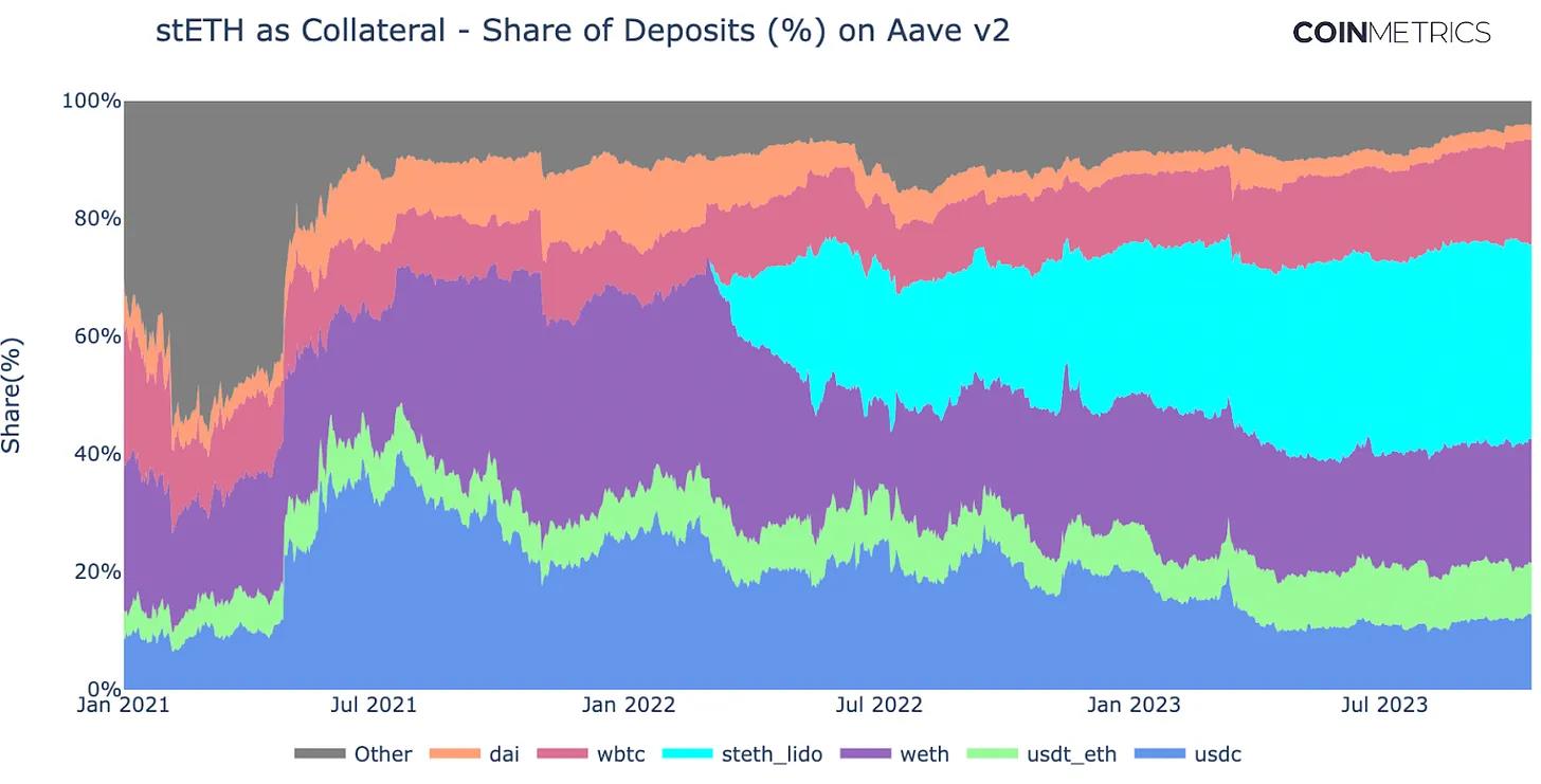 stETH 及其封装版本(wstETH)已成为几家去中心化金融(DeFi)平台包括 Aave、Maker 和 Compound,支持贷款的最大抵押品形式。如上所示,Aave v2上的存款总份额由 33% 的 stETH 组成,自引入以来迅速增长。与此同时,封装的 ETH(WETH)的份额从 39% 的高点下降到目前的 21% 。stETH 的增长受到了其收益和资本效率的推动,与持有或使用纯粹 ETH 相比,它提供了一个机会成本。