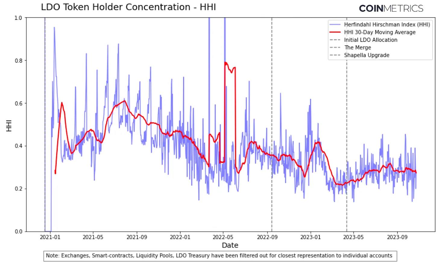 上图显示了 LDO 代币持有者的 Herfindahl Hirschman 指数(HHI)。HHI 度量了市场参与者在一个行业中的集中程度,本例中度量了持有 LDO 代币的账户集中情况。HHI 约为 0 表示均匀分布,而接近 1 的 HHI 值显示了分配极度集中,少数持有者控制着不成比例的供应。很明显,随着持有者基数的日常波动,集中度发生显著变化。HHI 在 1 以上的峰值可能是由于 2020 年 12 月的初始代币分配以及 LDO 价格大幅下跌导致集中度暂时增加。然而,从长期来看,LDO 代币持有者的集中度似乎存在下降趋势,如图中所示,从 2021 年初的 0.6 下降到 2023 年 10 月的 0.3 。