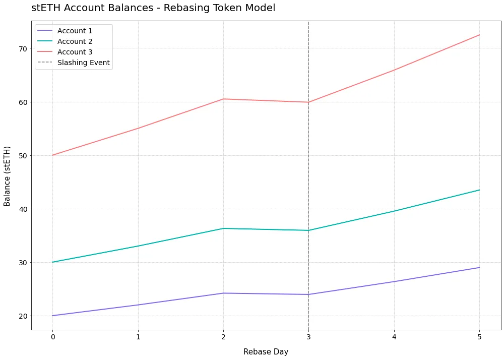 如上所示,stETH 的 Rebase 函数可以在以下高层次上进行可视化。例如,我们可以考虑 3 个假设账户,初始质押金额分别为 50、 30 和 20 ETH。预言机每天都会报告来自信标链的关于验证者之间汇集的以太币总量的每日统计数据。这一汇集总量的增加或减少(在验证者被削减的情况下)以及获得的奖励将反映在每日 Rebase 结束时用户的账户余额中,就像在传统储蓄账户中的余额增加一样。