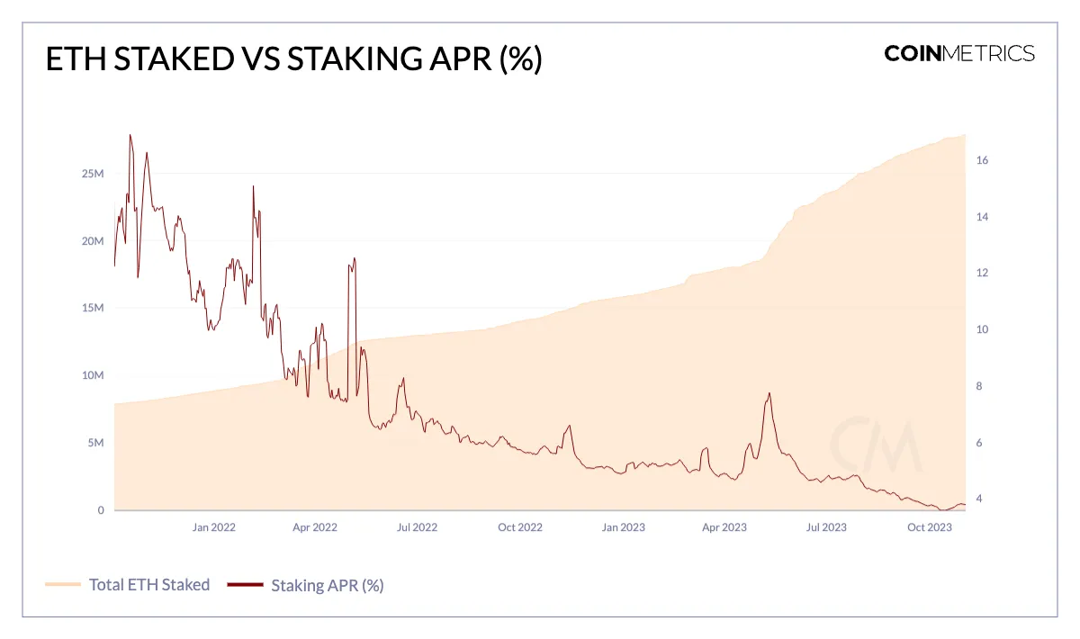 截至十月,已有约 2790 万 ETH(占当前供应的 23% )或价值约 400 亿美元的资产已被质押在信标链上,凸显了自 Shapella 硬分叉以来质押快速增长的趋势。然而,目前这种加速的采用似乎已经放缓。这种放缓也可以归因于自合并以来以太质押 APR 从 5.5% 以上下降到了 10 月的 3.5% ,这是由于大量验证者进入网络和更低的交易费用所致。相比之下,美国十年期国债收益率目前为 4.67% ,在寻求更安全和更高收益的时机方面产生了重大机会成本。然而,这些条件的改变可能导致这一前景发生变化,再次使链上收益变得有吸引力。
