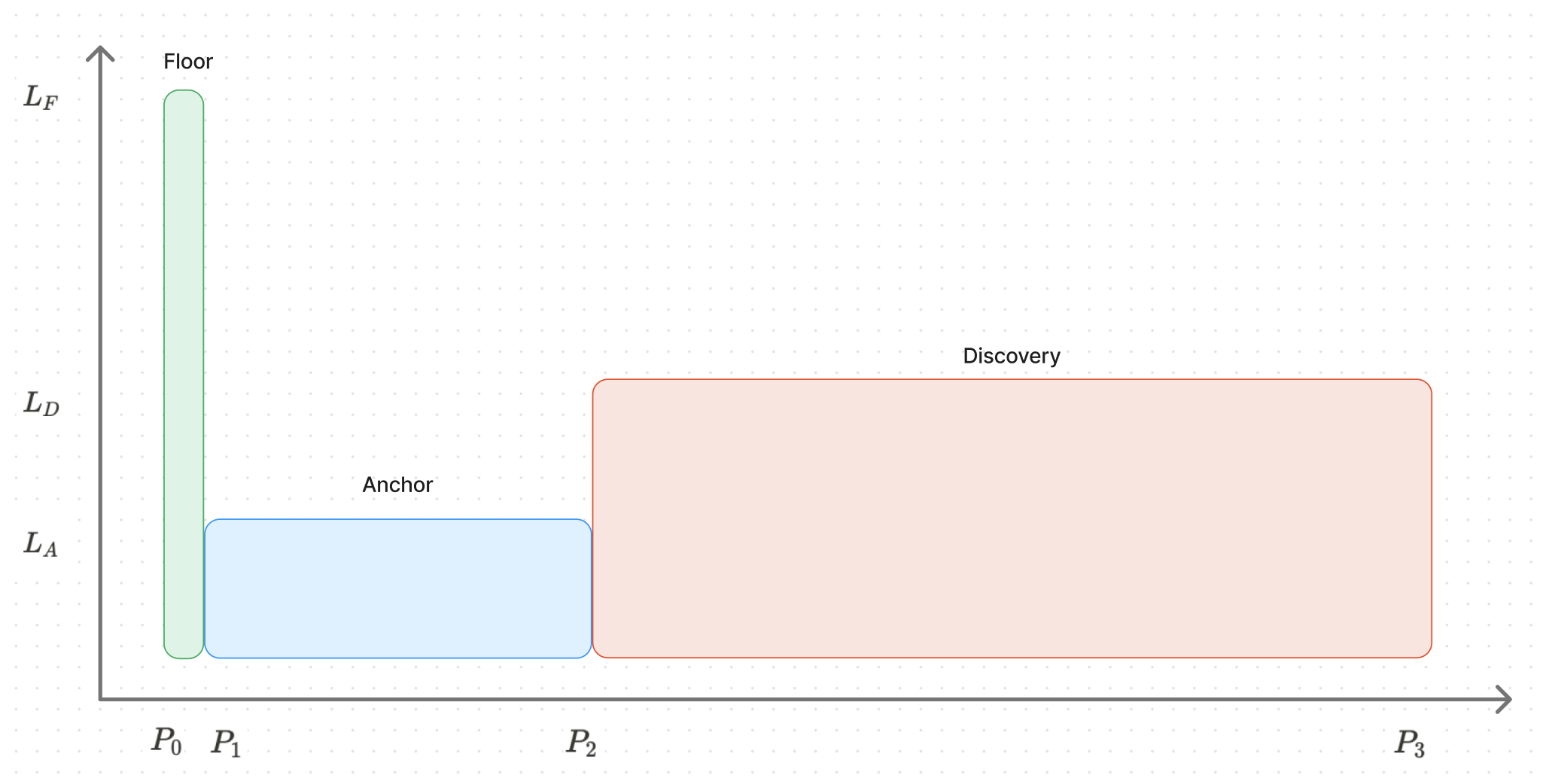 在 Baseline 的设计中,当基于该协议的代币被发行之时,Baseline 的做市策略会在 Uniswap V3 创建三个相互接续的做市范围,价格从低到高依次为“底价范围”(base position)、“锚定范围”(anchor position)以及“价格发现范围”(discovery position)。