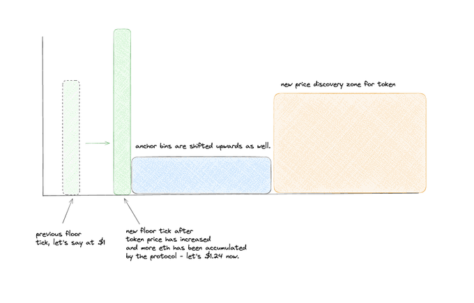 简单来说,“底价范围”的意义在于决定 BLV,即协议对代币价值的托底能力;“锚定范围”的意义在于让用户的正常交易更顺畅;“价格发现范围”则是新用户入场时购买新代币的地方。