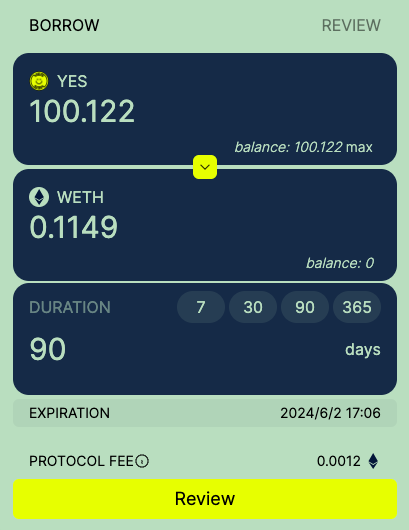 以下图的 YES 借贷为例,Baseline 允许用户以 YES 作为抵押品借出 ETH;贷款期限以天为单位,可以是任意天数;用户除了需要在开设借贷头寸时支付每日 0.01095% 的一次性费用外(前文提到过的协议收入),无需再承担其他利率成本;借贷头寸不会面临清算风险,若违约只会销毁作为抵押资产的 YES。