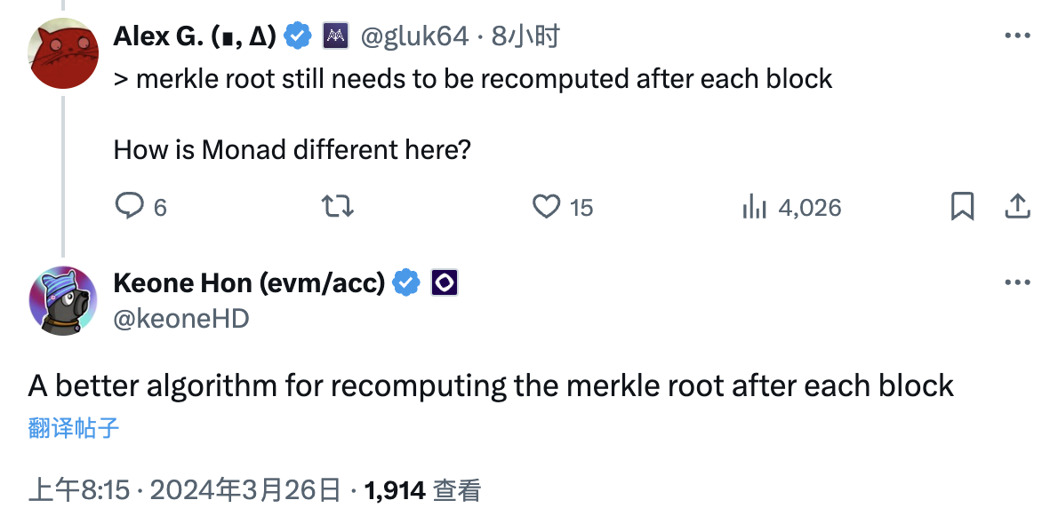 zkSync 联合创始人 Alex Gluchowski 针对文中“每个区块之后都需要重新计算 merkle root”的内容询问 Monad 在这方面有何不同?”