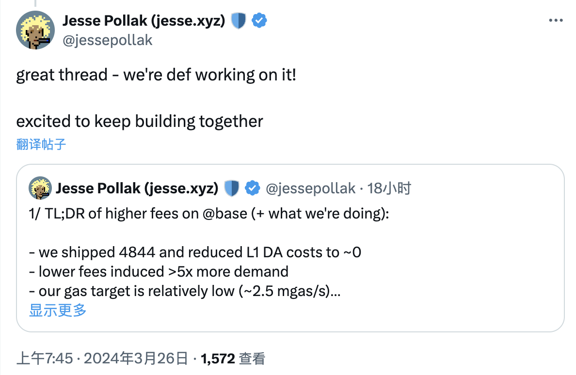 Base 负责人 Jesse Pollak 亦借此解释了为何 Base 在坎昆升级之后 gas 费用不降反增,其表示 EIP-4844 已大幅降低了 Layer 1 层面的 DA 成本,gas 费用本该降低,但由于网络交易需求增长了 5 倍有余,且 Base 网络之上的区块存在 250 gas/s 的限制,需求大于供给使得 gas 费用出现了上涨。