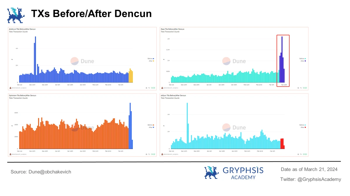 After the upgrade was completed, Bases transaction volume was the first to surge and break through the original bottleneck, from the previous 500,000 to 2 million, which means that EIP-4844 had a direct impact on it and benefited most obviously.