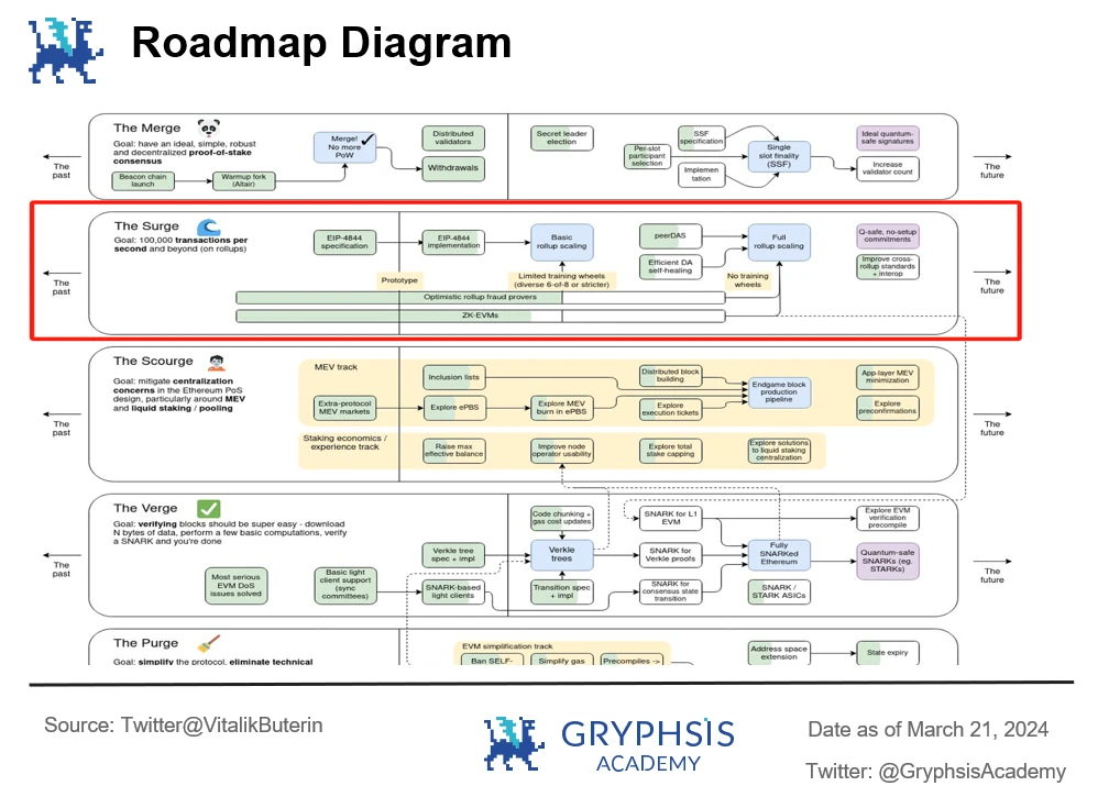 1. First of all, the Dencun upgrade corresponds to The Surge part of Ethereum’s development plan. It aims to improve the scalability and modularity of Ethereum, enhance the security functions of the Ethereum network, and improve the overall usability: