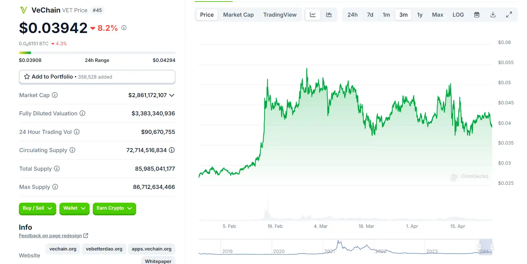 项目代币 VET 在今年年初有一次不错的涨幅,相较于该板块其他代币走势相对稳定。