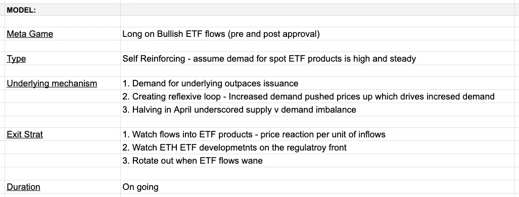 Similar to the ETH Killer metagame (Example 1), this metagame is self-reinforcing. ETF products trade seven days a week, so the price of BTC trades (loosely) as the beta of these ETF flows. Given the underlying mechanics, we can make some assumptions about ETF flows and prices: