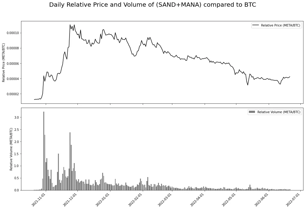 Again, in order to think about an exit strategy, we need to revisit the assumptions of the underlying mechanism. Namely, the underlying mechanism of a one-time catalyst is self-defeating. Therefore, one should actively look for ways to exit a trade. If we look at the chart below, we can see that it reflects the stylized example above, and relative volume can be used as a proxy for share of the attention economy. Additionally, it is important to understand market structure, and it is impossible for $SAND and $MANA to consistently trade three times as much as $BTC, which defies logic.