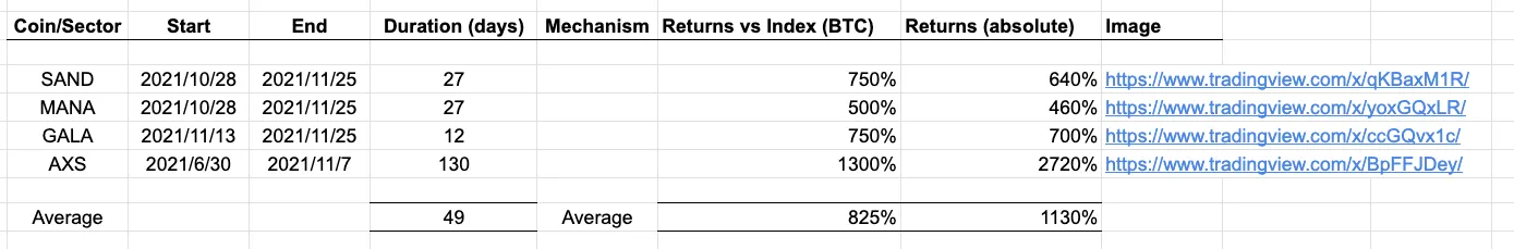 On October 28, 2021, Facebook changed its name to META, which triggered a speculative frenzy for crypto projects related to the metaverse, which is a fairly obvious foundational mechanism. The difference between this foundational mechanism and the previous one is the duration. Example 1 is self-reinforcing, while example 2 is self-defeating, what I mean by this is that the catalyst in example 2 is a one-time event. This changes the rules of the game slightly, let me explain.