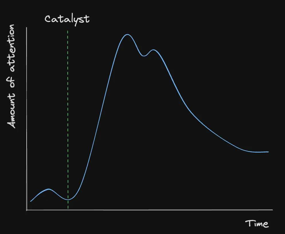 • Catalysts, usually (but not limited to) price movement - this sparks a narrative, and price moves with the narrative. The reason for the price movement can often be traced back to a protocol upgrade, KPI, or other event/metric.