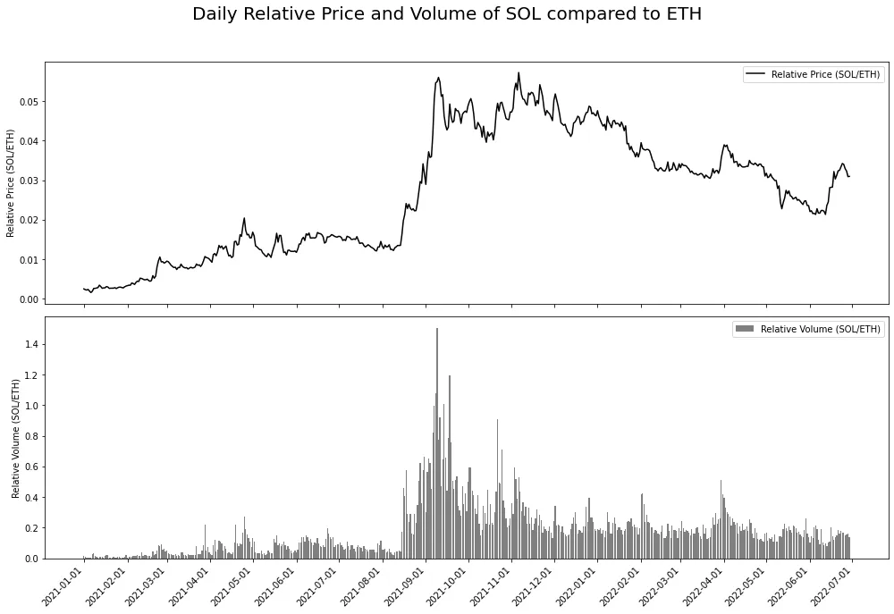 There are two graphs below - SOL vs ETH and AVAX vs ETH. They show the relative volume and relative price performance of SOL and AVAX to ETH, with data sourced from the Binance Futures API. The idea is simple, use relative volume as a proxy for relative interest and see how this matches up with relative price performance.