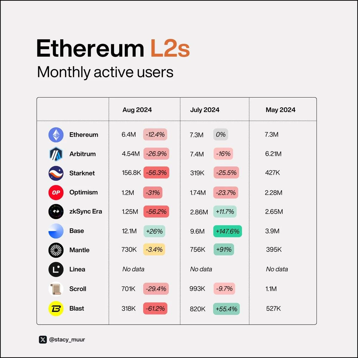 @0x Mantleと@base は良好なパフォーマンスを示しましたが、 @StarknetFndn 、 @zksync 、 @blast のパフォーマンスは低かったです。