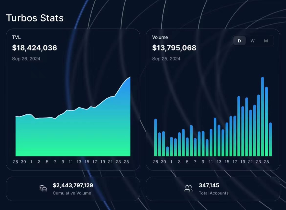 自平台上线以来,Turbos 的活跃账户总数已达到 34.6 万,累计交易量突破 24 亿美元,彰显了其强大的用户基础和市场需求。这一切都表明,Turbos Finance 正引领 Sui 生态的未来发展,成为 Meme 交易的核心驱动力。