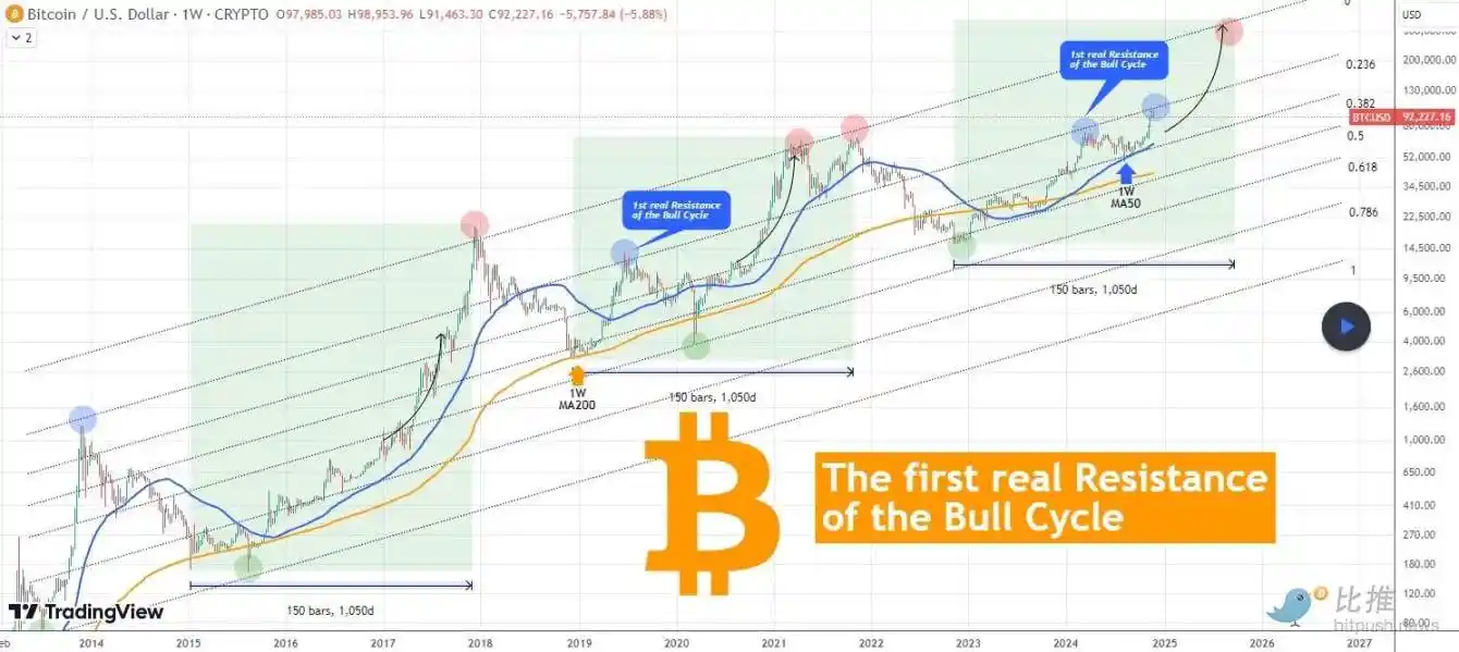 TradingShot 表示,最近的回调是因为比特币触碰到了「牛市周期的第一个真正阻力」。