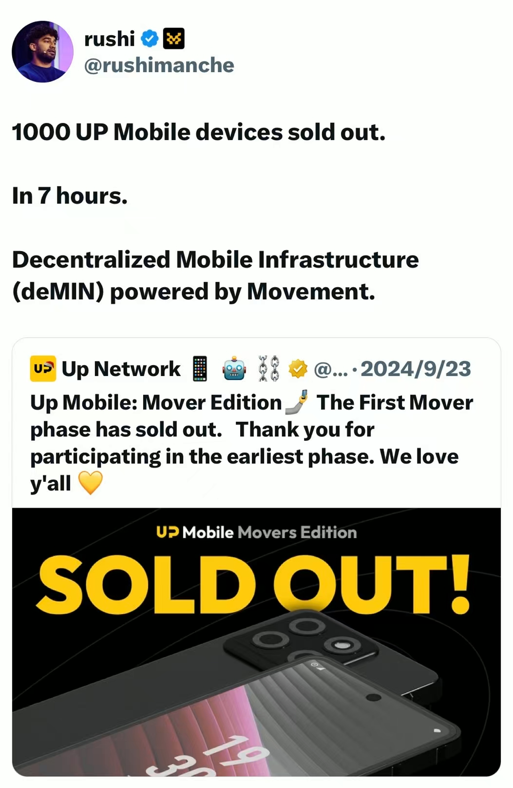 Up network 手机每台可以获得 1000 枚 move 代币的空投,move 官方 X 推特转推: