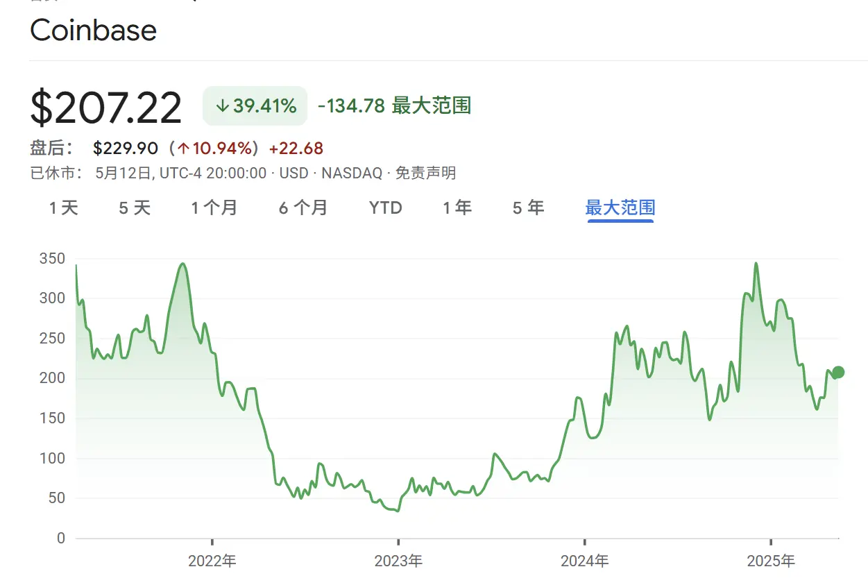 Coinbase's stock price trend is deeply tied to the bull-bear cycle of the crypto market. In 2022, against the backdrop of a sharp market correction, COIN's stock price once fell to $33, a year-on-year decline of 86%. It was not until October 2023 that market sentiment gradually warmed up and the stock price re-entered the upward channel.