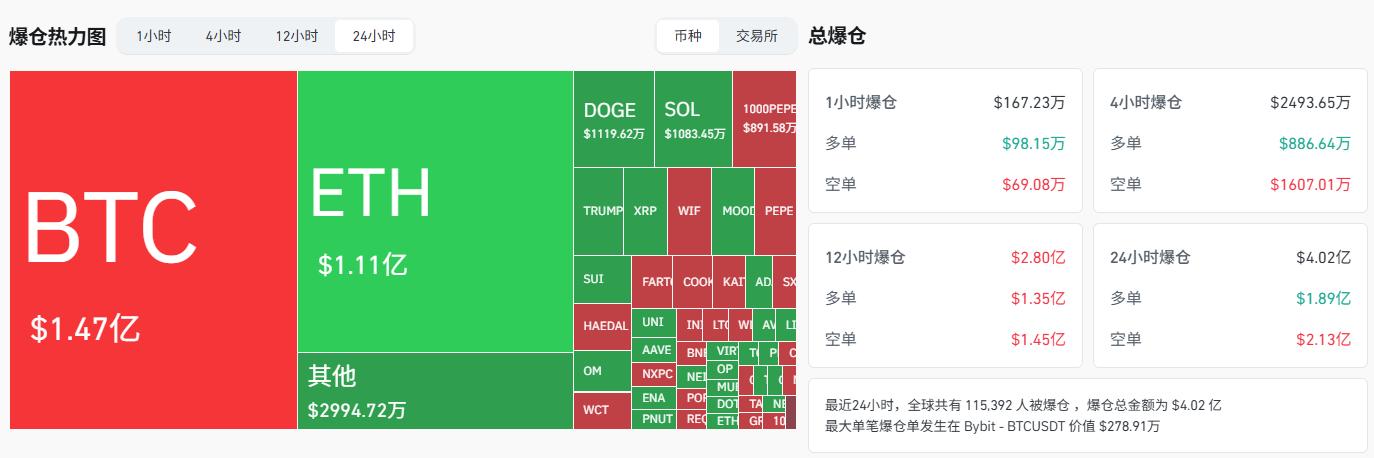 衍生品交易方面,Coinglass 数据显示,过去 24 小时全网爆仓 4.02 亿美元,其中多单爆仓 1.89 亿美元,空单爆仓 2.13 亿美元。从币种来看,其中 BTC 爆仓 1.47 亿美元,ETH 爆仓 1.11 亿美元。
