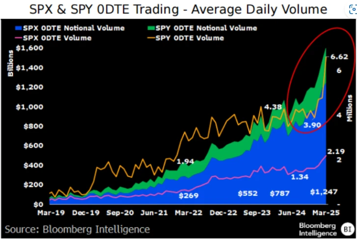 另一个维度,近几年大家对末日期权这种高赔率的短线交易越来越偏爱—— 2016 年以来,小型交易用户开始成群结队地涌入期权,其中 0 DTE 期权交易占 SPX 期权总成交量的比例从 5% 上升至 43% 。