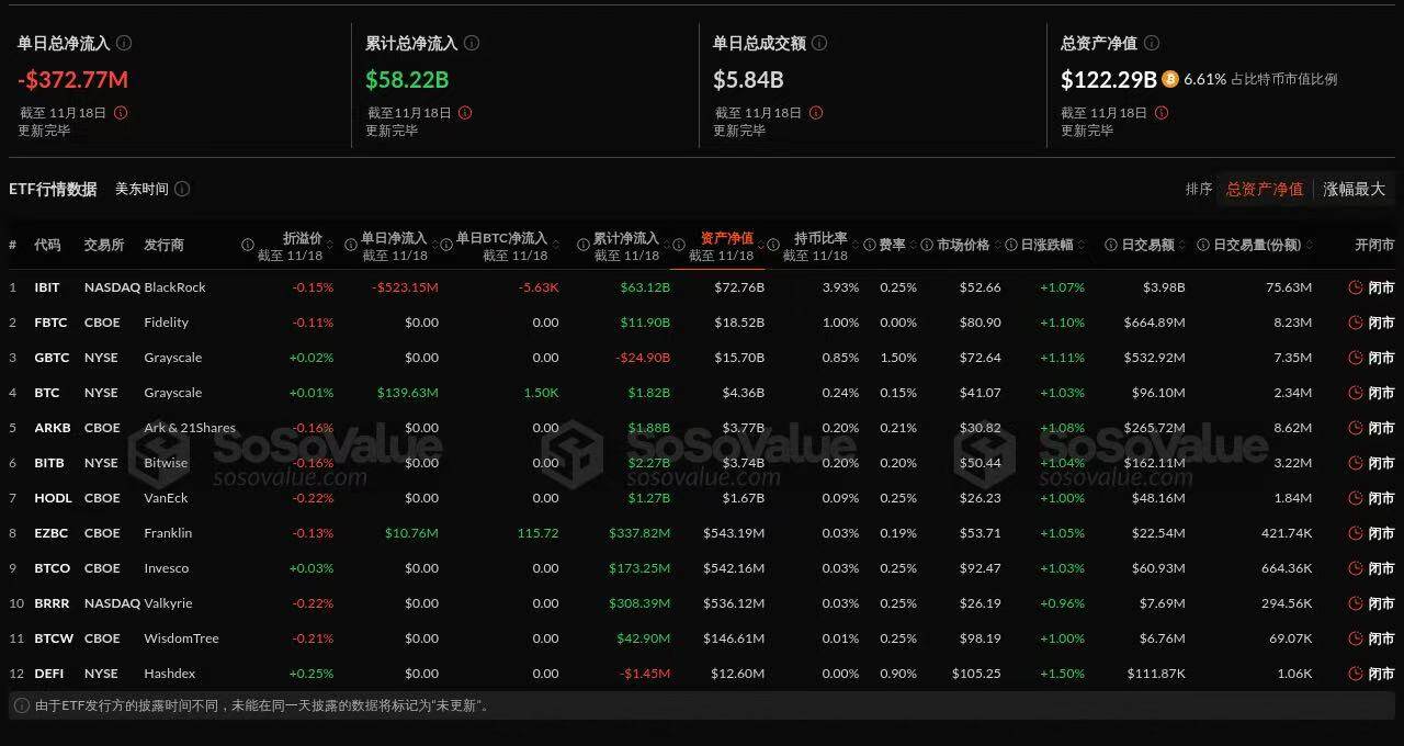 Odaily星球日报讯 根据 SoSoValue 数据,昨日(美东时间 11 月 18 日)比特币现货 ETF 总净流出 3.73 亿美元。