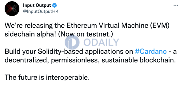 Cardano开发公司Input Output在推特上表示,已在测试网推出兼容EVM的Cardano侧链的Alpha版本。