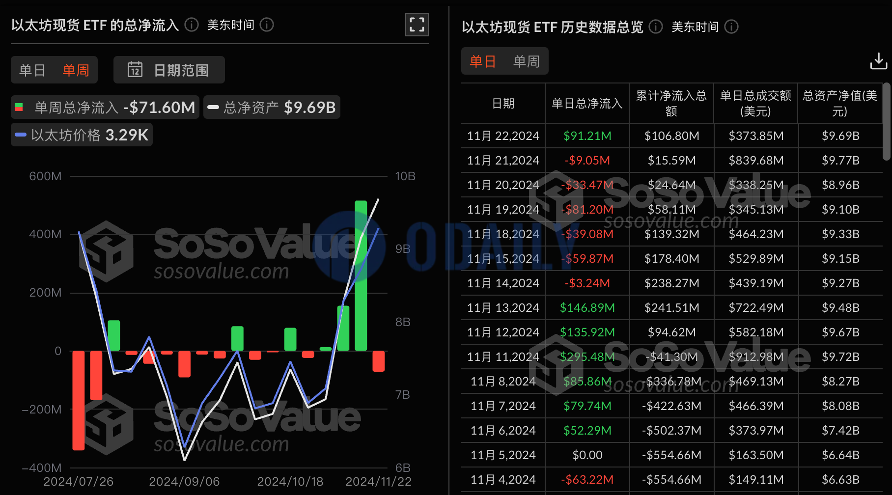 Odaily แพลนเน็ต เดลี่ ตามข้อมูล SoSoValue ETF สปอต Ethereum มีการไหลออกสุทธิ 71.6 ล้านดอลลาร์สหรัฐในสัปดาห์เดียวในวันทำการซื้อขาย (18 พฤศจิกายนถึง 22 พฤศจิกายน ตามเวลาตะวันออก) ในหมู่พวกเขา Grayscale Ethereum Trust ETF ETHE มีการไหลออกสุทธิรายสัปดาห์ที่ 95.56 ล้านดอลลาร์สหรัฐ และการไหลออกสุทธิในอดีตของ ETHE ในปัจจุบันอยู่ที่ 3.34 พันล้านดอลลาร์สหรัฐ Ethereum Spot ETF ที่มีการไหลเข้าสุทธิที่ใหญ่ที่สุดในสัปดาห์เดียวคือ Blackrock Ethereum ETF ETHA โดยมีการไหลเข้าสุทธิรายสัปดาห์ที่ 78.34 ล้านดอลลาร์สหรัฐ การไหลเข้าสุทธิในอดีตของ ETHA ในปัจจุบันสูงถึง 1.8 พันล้านดอลลาร์ ตามมาด้วย Bitwise Ethereum ETF ETHW โดยมีการไหลเข้าสุทธิรายสัปดาห์ที่ 7.85 ล้านดอลลาร์สหรัฐ และการไหลเข้าสุทธิในอดีตของ ETHW ในปัจจุบันสูงถึง 381 ล้านดอลลาร์สหรัฐ ณ เวลาปัจจุบัน มูลค่าทรัพย์สินสุทธิรวมของ Ethereum Spot ETF อยู่ที่ 9.687 พันล้านดอลลาร์สหรัฐ อัตราส่วนสินทรัพย์สุทธิของ ETF (มูลค่าตลาดตามสัดส่วนของมูลค่าตลาดรวมของ Ethereum) อยู่ที่ 2.44% และการไหลเข้าสุทธิสะสมในอดีตได้สูงถึง 107 ล้านเหรียญสหรัฐ
