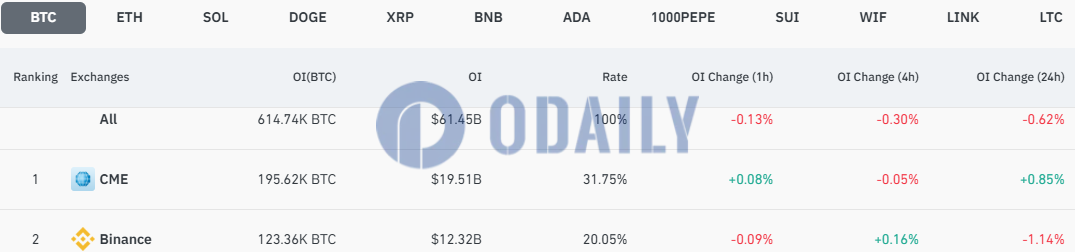 Odaily星球日报讯 据 Coinglass 数据显示,全网比特币期货合约未平仓头寸为 61.474 万枚 BTC(约合 614.5 亿美元),24H 跌幅 0.62%,其中: