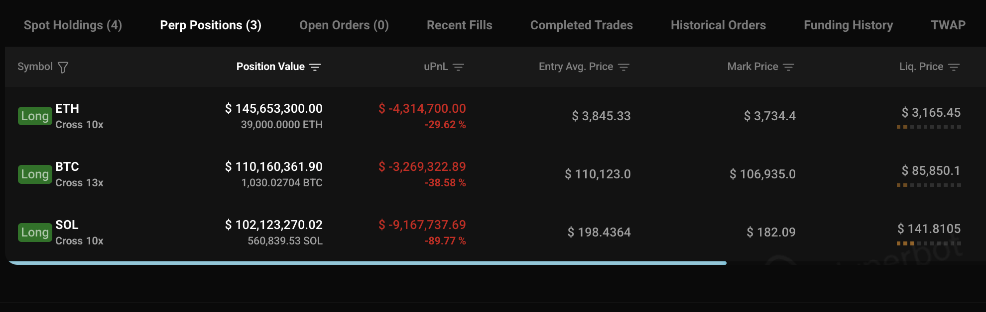 จากรายงานของ Odaily Planet Daily พบว่าข้อมูลของ Hyperbot แสดงให้เห็นว่า "วาฬที่มีอัตราการชนะ 100% นับตั้งแต่วันที่ 11 ตุลาคม" ได้สะสมผลขาดทุนที่ยังไม่เกิดขึ้นจริง (unrealed loss) ไว้มากกว่า 16.75 ล้านดอลลาร์สหรัฐฯ ในตำแหน่ง long ใน BTC, ETH และ SOL โดยเฉพาะอย่างยิ่ง: