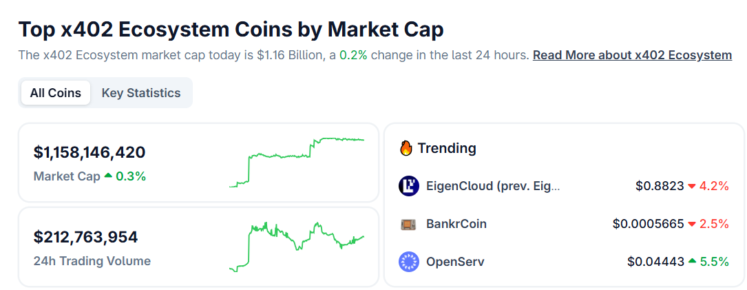 มูลค่าตลาดรวมของโทเค็นระบบนิเวศ x402 ทะลุ 1 พันล้านดอลลาร์แล้ว โดยเพิ่มขึ้น 567.7% ในช่วง 7 วัน