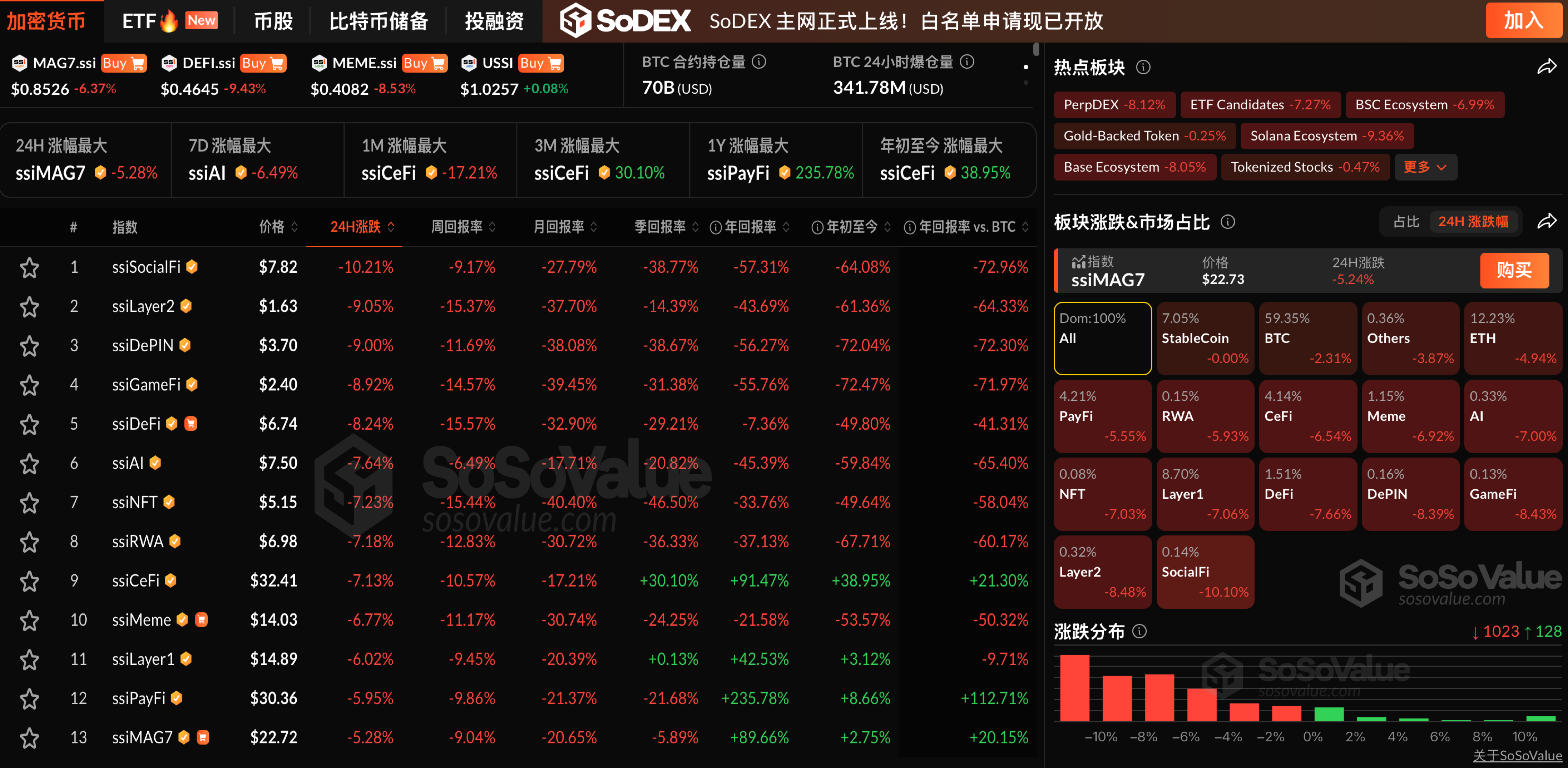 ดัชนีกลุ่มสกุลเงินดิจิทัล ซึ่งสะท้อนถึงผลการดำเนินงานในอดีตของภาคส่วนนี้ แสดงให้เห็นว่าดัชนี ssiSocialFi, ssiLayer2 และ ssiDePIN ลดลง 10.21%, 9.05% และ 9.00% ตามลำดับ