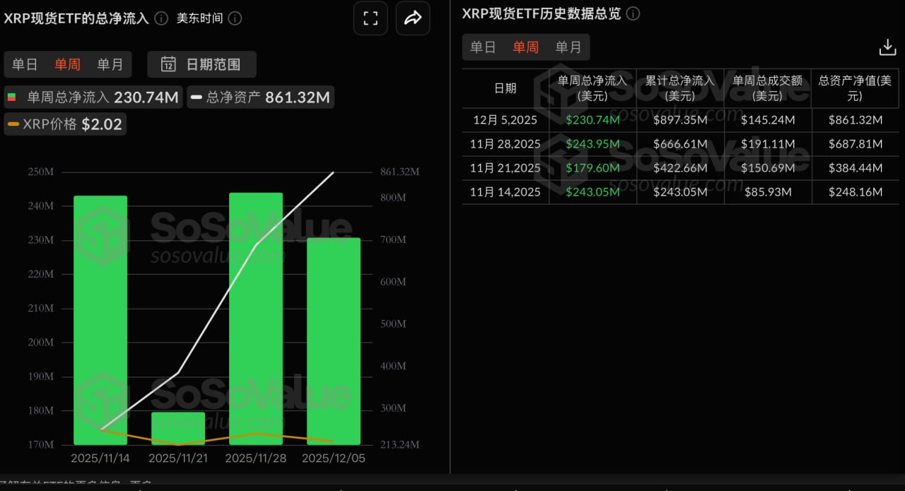 ตามข้อมูลจาก SoSoValue กองทุน ETF XRP Spot มีเงินไหลเข้าสุทธิ 231 ล้านดอลลาร์ในสัปดาห์ที่แล้ว (1 ธันวาคม ถึง 5 ธันวาคม ตามเวลาตะวันออก)