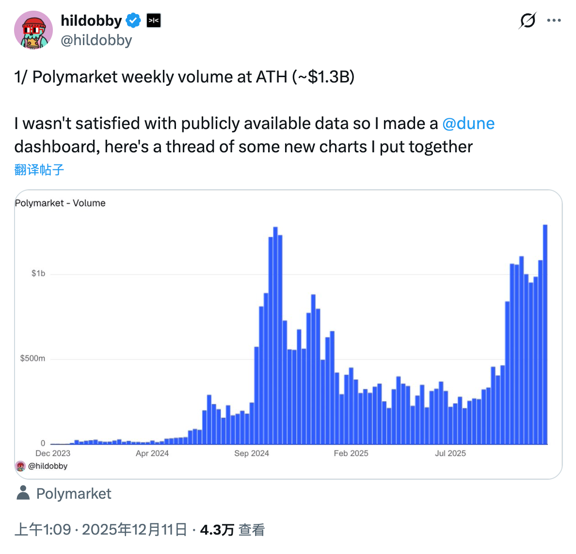 จากรายงานของ Odaily Planet Daily ฮิลด็อบบี้ ผู้อำนวยการฝ่ายข้อมูลของ Dragonfly กล่าวในบทความบน X ว่าเขาไม่พอใจกับแหล่งข้อมูลสาธารณะที่มีอยู่สำหรับ Polymarket ในปัจจุบัน จึงได้สร้างแดชบอร์ดข้อมูลขึ้นใหม่บน Duna สัปดาห์นี้ ปริมาณการซื้อขายรวมของ Polymarket ทำสถิติสูงสุดตลอดกาล (ประมาณ 1.3 พันล้านดอลลาร์สหรัฐ) แซงหน้าจุดสูงสุดในอดีตในช่วงการเลือกตั้งประธานาธิบดีสหรัฐฯ