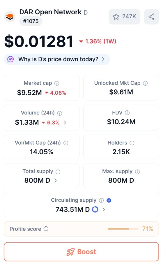 Odaily ตามการตรวจสอบข้อมูลบนเชน ที่อยู่หนึ่ง (0xae579C73...c90a47C9E) ได้รับโทเค็น DAR Open Network (D) จำนวน 100,109,055.4 เหรียญ ที่ถูกสร้างและโอนมาจากที่อยู่ว่าง (Null: 0x000...000) ในวันนี้ ตามข้อมูลเรียลไทม์จาก CoinMarketCap โทเค็น D มีอุปทานสูงสุดและอุปทานรวมที่กำหนดไว้ที่ 800 ล้านเหรียญ ก่อนการสร้างครั้งใหญ่ครั้งนี้ อุปทานหมุนเวียนของมันถึง 743 ล้านเหรียญแล้ว มูลค่าตามราคาตลาดหมุนเวียนและมูลค่าที่ยอมรับอย่างเต็มที่ (FDV) ใกล้เคียงกันมาก การสร้างครั้งนี้ทำให้โครงการเข้าสู่สภาวะหมุนเวียนเต็มที่เกือบสมบูรณ์ ปัจจุบัน โทเค็นจำนวนนี้มีมูลค่าประมาณ 1.286 ล้านดอลลาร์สหรัฐ ตามราคาต่อหน่วยที่ 0.01286 ดอลลาร์